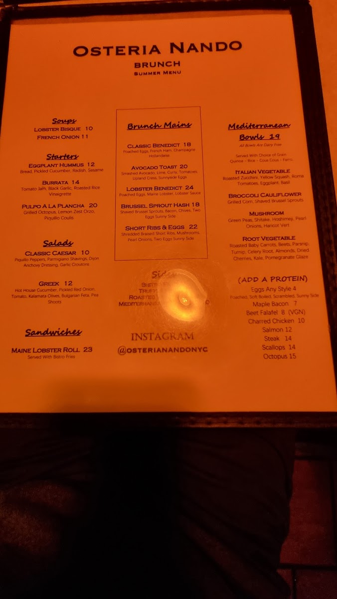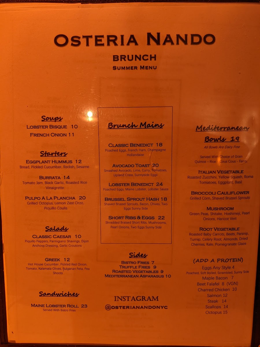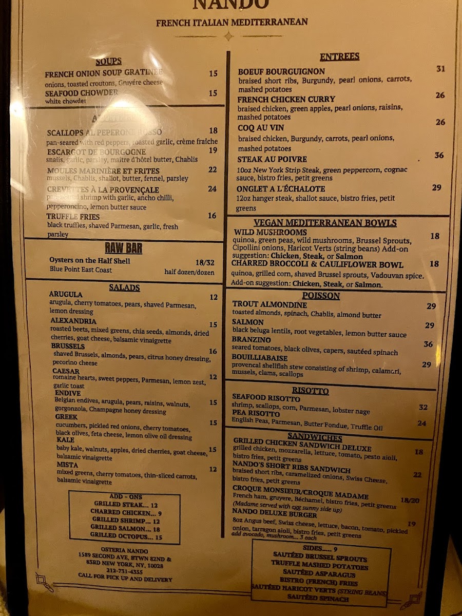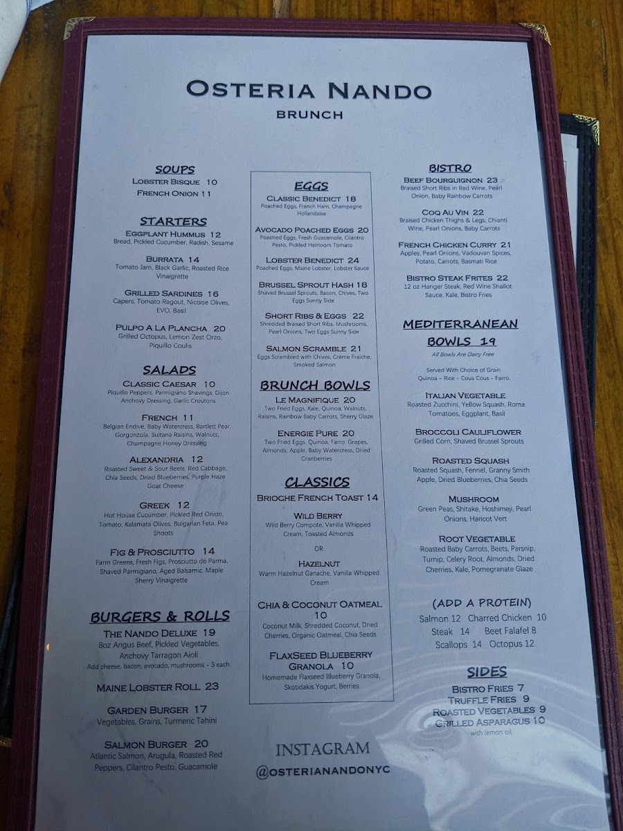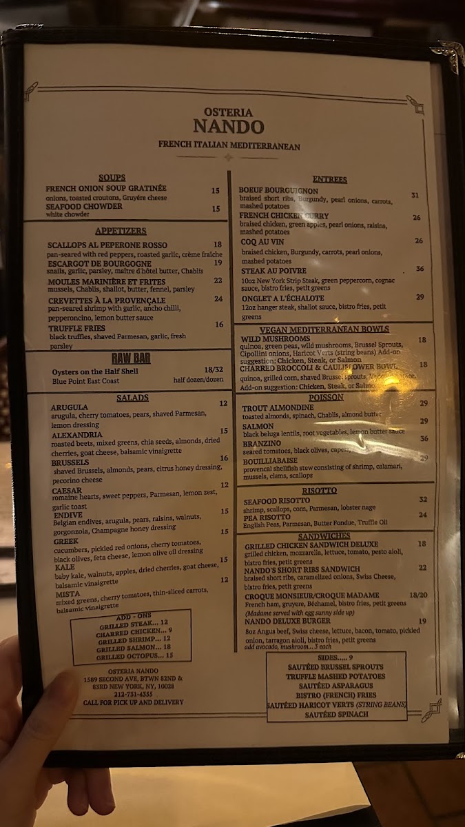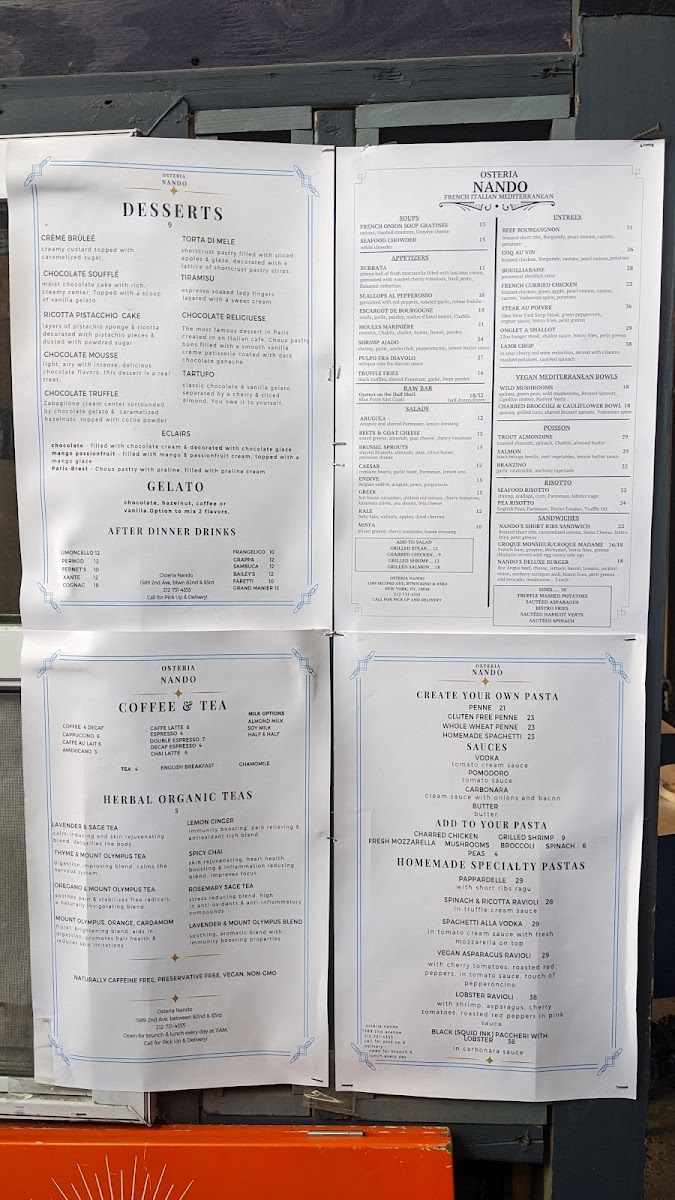 Osteria Nando offers a thoughtfully curated menu that blends Mediterranean, French, and Italian influences with a focus on familiar, well-crafted dishes. The menu encourages relaxed dining, whether you're settling in for a leisurely brunch, enjoying a comforting dinner, or unwinding with a carefully mixed cocktail.