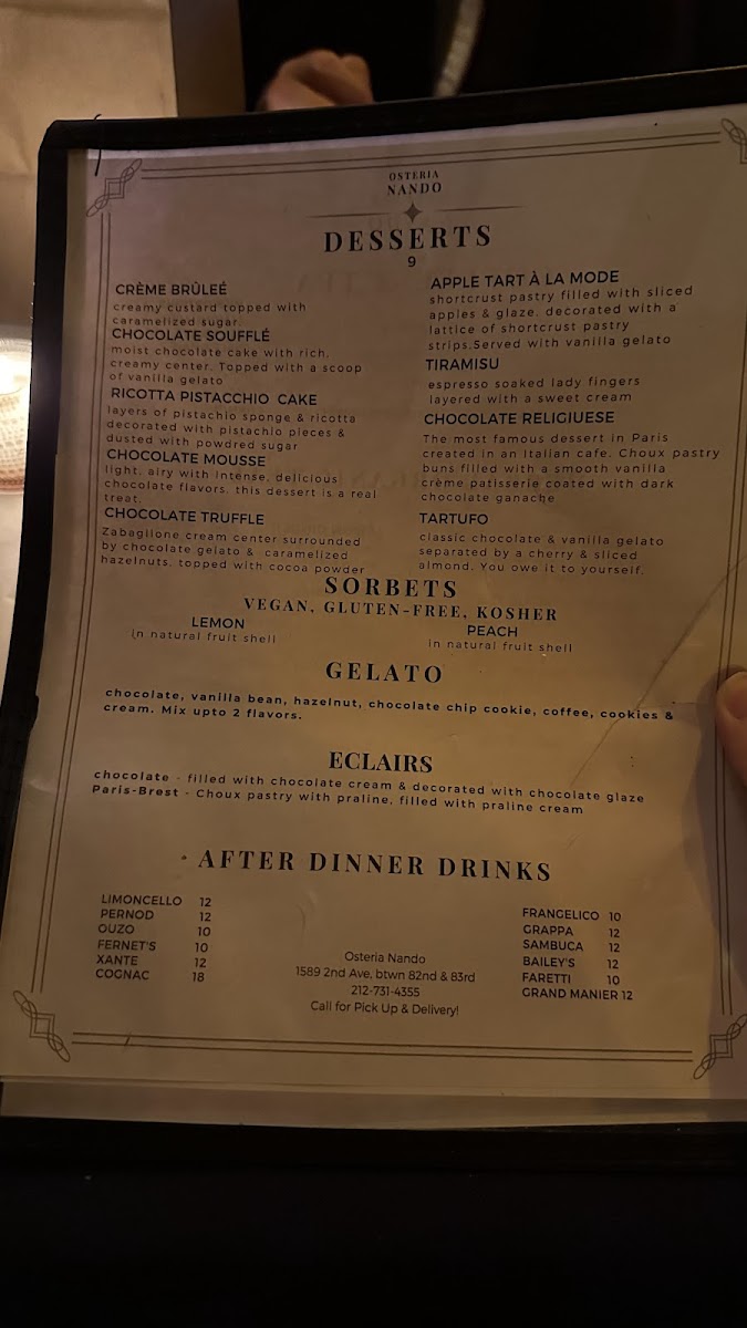 The atmosphere at Osteria Nando is enhanced by these approachable dishes and drinks, which suit a variety of occasions — from intimate dinners to casual outings. The kitchen’s attention to flavor and balance pairs well with the attentive, unhurried service, making each visit feel both inviting and thoughtfully paced.